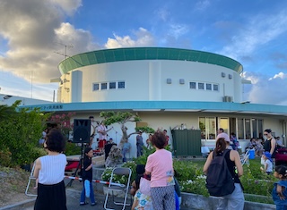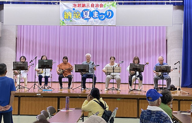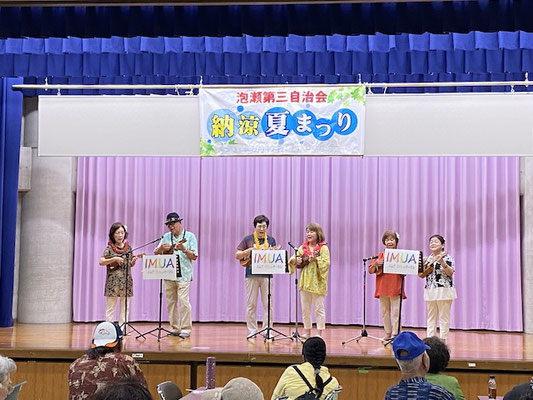 8月10日オカリナサークルは、今年も泡瀬第三自治会の夏まつりに参加してきました。泡瀬第三自治会の夏まつりは、飲み物や食べ物を購入してから中のホールのテーブルでステージを楽しむスタイルです。昨年から暑さに配慮してとの事です。