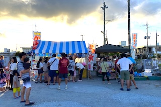 写真には撮りきれていないのですが、自治会のボランティアさんが大勢活躍しており、来場者もとても多く和気藹々と活気のあるお祭りでしたよ。中はホールから廊下まで人がいっぱいで歩くのも困難なくらい。今年は中庭にもミニステージが作られ、夕暮れ時から歌三線を聴きながら外のテントでビールやかき氷を食べたりこちらも良い雰囲気です。