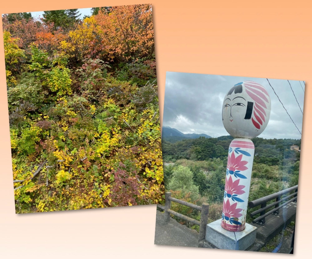 蔵王のお釜から紅葉を見ながら蔵王エコーラインを下り、遠刈田温泉を通過。この辺りは「宮城伝統こけし」が有名だそうで、橋にも大きなこけしが建っていました。愛嬌のある表情ですね。