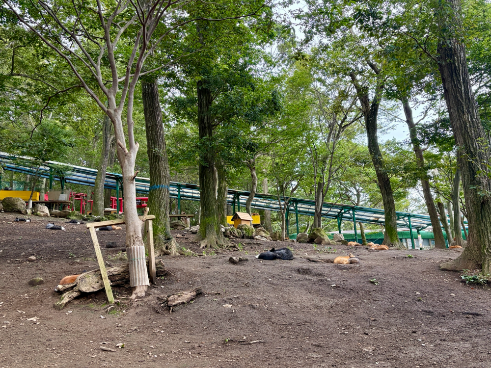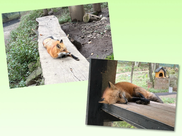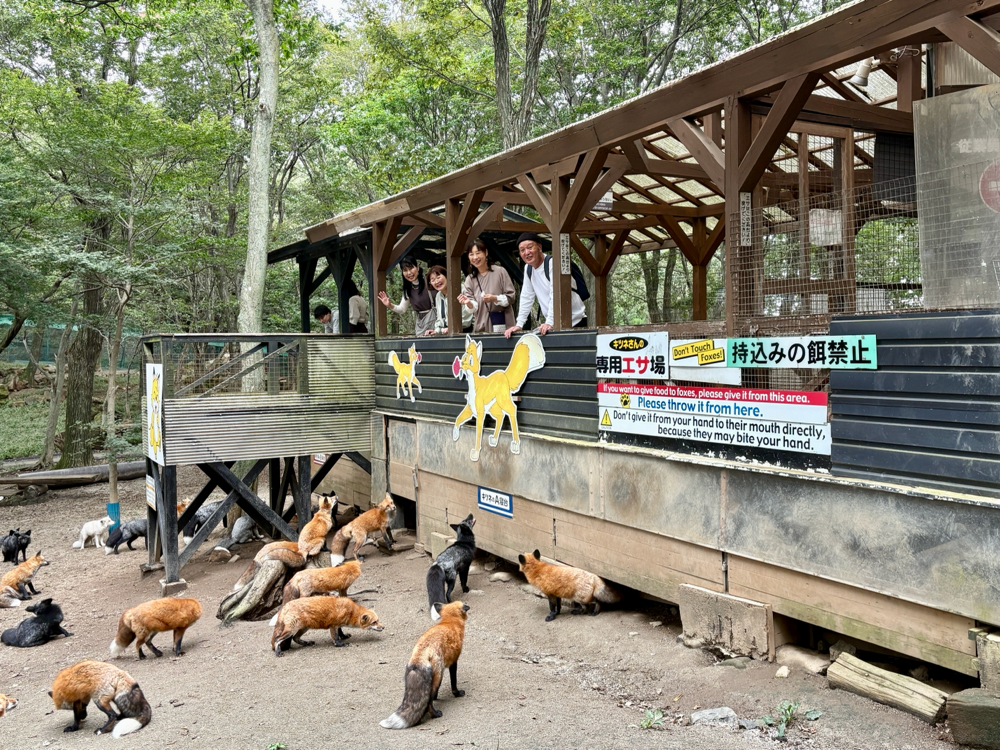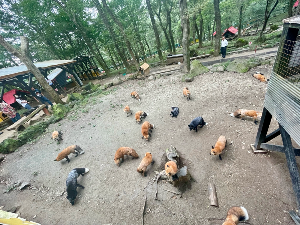 敷地内には数種類のキツネが放し飼いになっていて、間近で観察することができます。キツネの魅力と言えば、やはりフサフサの尻尾。丸まって寝ている姿もキュートです。キツネは夜行性なので寝ている子が多かったのですが、餌やり場には昼間でも元気な子たちが集まっていました。